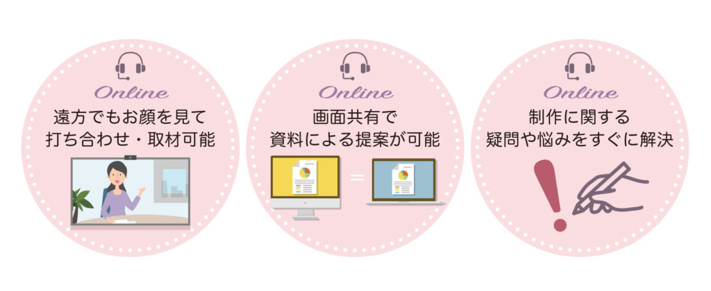 ビジョンパンフレットではWEB会議システムzoomを利用したオンライン打ち合わせ・オンライン取材に対応しています。実際にお会いしているようにお話しでき、パソコン操作の画面を共有することで資料を確認しながら詳細な打ち合わせが可能になります。