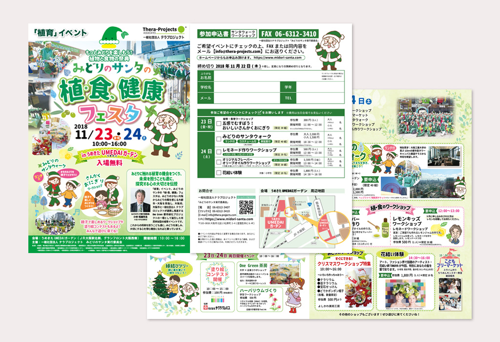 梅田でお子さんといっしょに植・食を楽しむ「植育」イベント、みどりのサンタの「植・食、健康」フェスタのイベントパンフレットを制作致しました。食育指導士によるお話あり!「おにぎりワークショップ」人工知能作曲による!?テーマ曲披露!「ステージイベント」他、梅田のみどりを探そう!「みどりのサンタウォーク」ファッション界で話題のアーティストTAKUYA氏による「花結い体験」などお子さんが楽しめるワークショップや身体に優しいスイーツの販売等楽しい催しを開催されました。